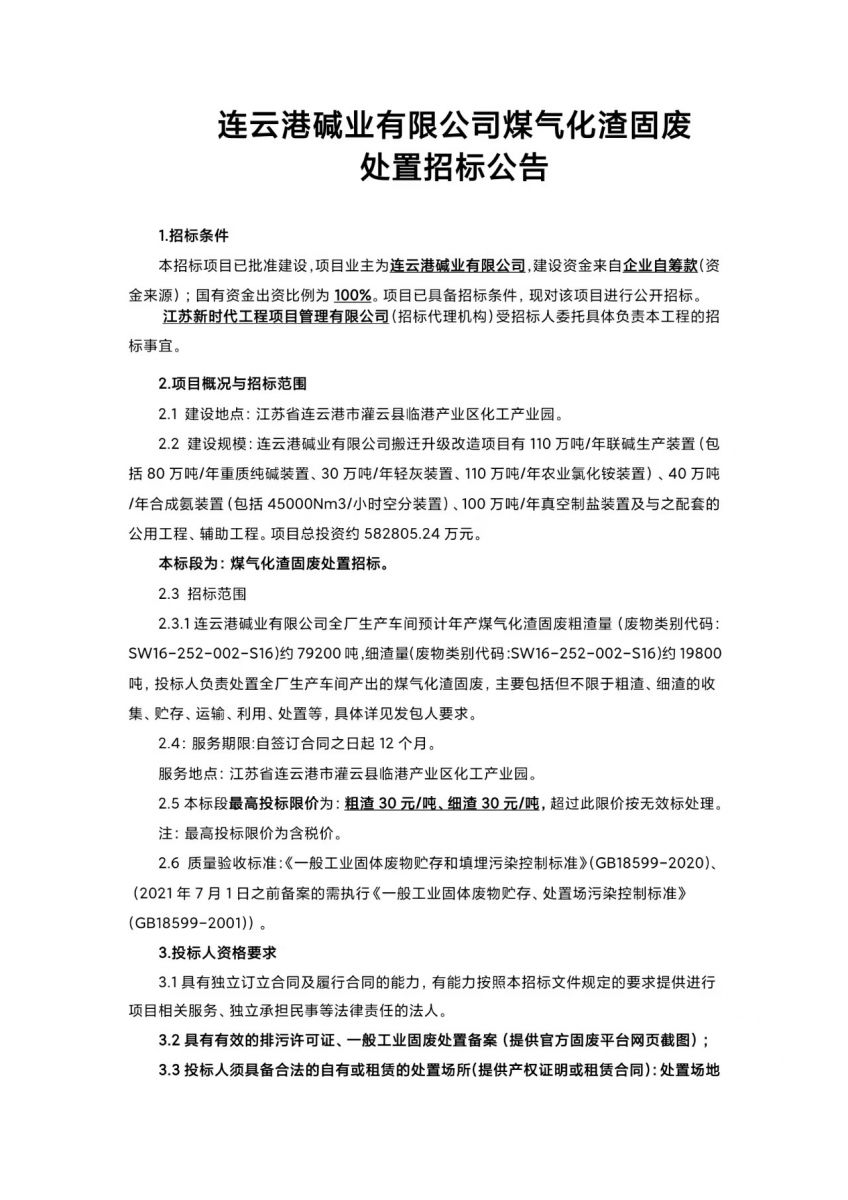 連云港堿業(yè)有限公司煤氣化渣固廢處置招標公告