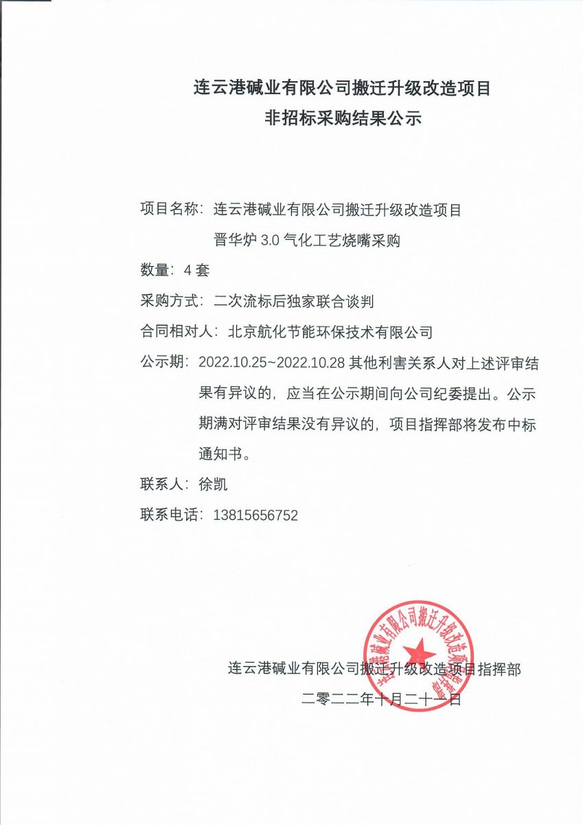晉華爐3.0氣化工藝燒嘴非招標(biāo)采購結(jié)果公示