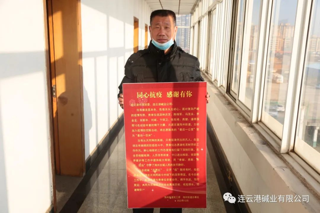11月份疫情期間,根據(jù)市里統(tǒng)一安排,公司組織抗疫志愿者服務(wù)隊,全身心投入海州區(qū)疫情防控一線。公司職工林慶芝、陳瑞軍、馮茂永、李金龍、張新豐、劉斌、卞保衛(wèi)、張名琦、高健、潘德強等10名職工積極響應(yīng)公司黨委的號召,投入到社區(qū)志愿者服務(wù)行列,沖鋒在抗疫最前沿,為疫情防控作出了突出貢獻(xiàn)。近日,海州街道黨工委、海州街道辦事處送來了感謝信以及錦旗。